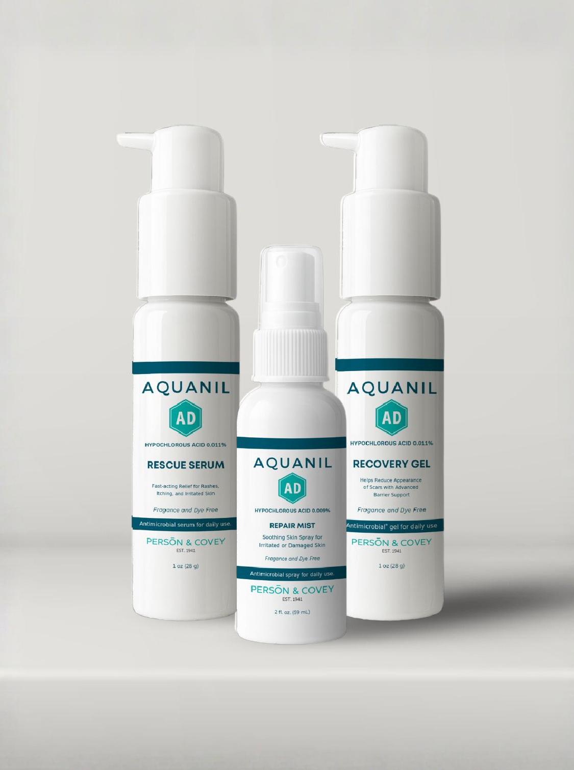 Aquanil AD is a dermatology-inspired line featuring hypochlorous acid–based formulas designed to support sensitive and recovering skin.